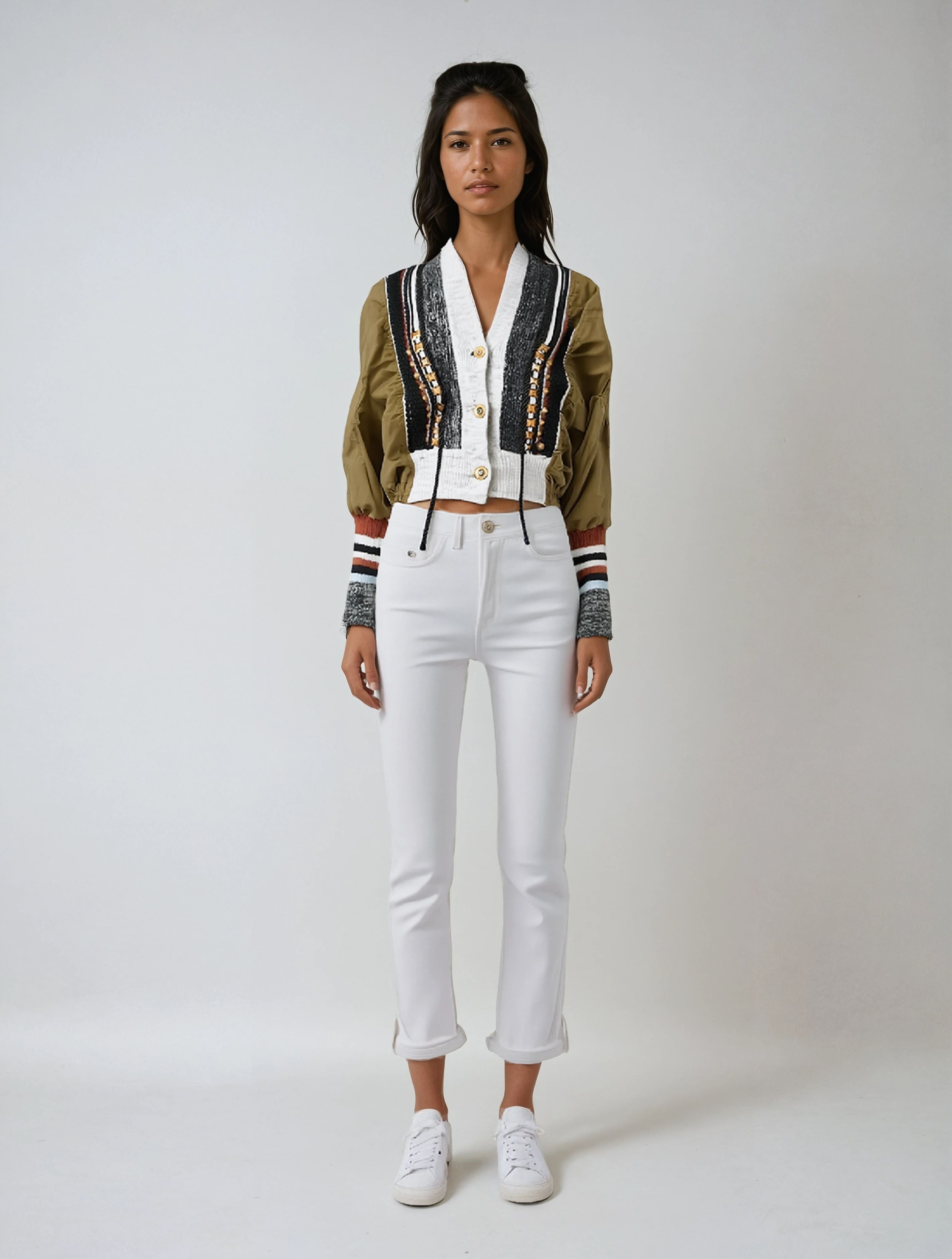 The Rivet Tassel V-Neck Jacket is a bold fusion of eclectic textures and modern streetwear edge. Designed with a deep V-neckline, it features contrasting knit panels with rivet detailing, tassel ties for added drama, and voluminous sleeves crafted from smooth polyester fabric. Striped ribbed cuffs and hem highlight its sporty yet artisanal character, while the cropped length keeps the silhouette sharp and fashion-forward.