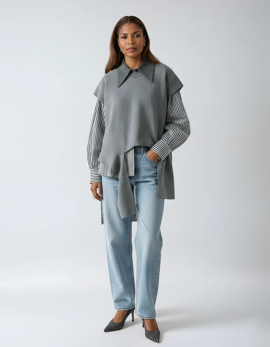 This blouse blends classic tailoring with contemporary asymmetry, featuring a striped shirt base layered with a draped knit overlay. The pointed lapel collar and voluminous striped sleeves bring structure, while the uneven hemline adds an avant-garde twist. Designed for modern minimalists, it’s a versatile top that balances edge with sophistication.