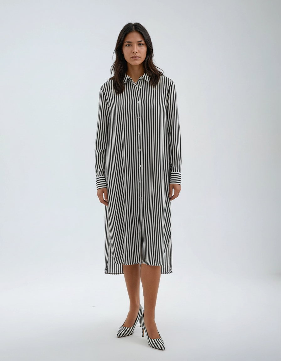Made from jersey fabric, this dress combines lightweight comfort with breathable structure. The vertical stripes are carefully aligned for a clean finish, while the buttons and cuffs add tailored touches. The fabric drapes smoothly, giving the dress a relaxed yet refined appeal.