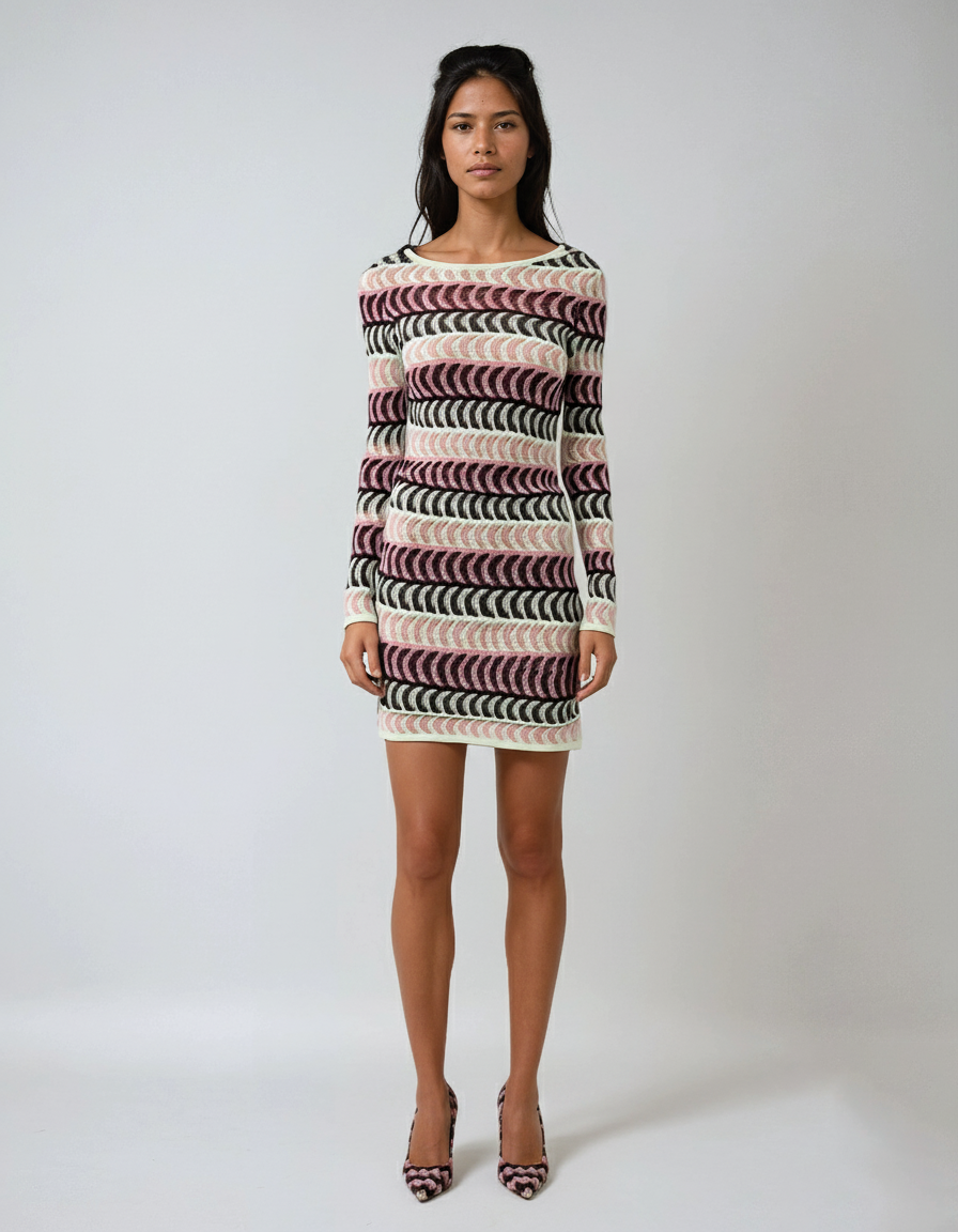 Sleek, playful, and curve-enhancing, this summer-ready sweater dress features a large round neckline and a slim-fit silhouette that hugs the body from shoulder to hem. Designed with full-length sleeves and a mini skirt cut, it blends casual street style with flattering femininity. The textured knit fabric gives it subtle dimension, while the striped pattern elongates the figure and adds visual energy.