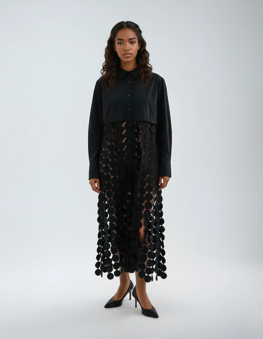 This big-size-friendly midi shirt dress blends classic tailoring with modern artistic flair. Featuring a lapel turn-down collar and full-length sleeves, it carries the sophistication of a shirt silhouette with the ease of casual wear. Its standout detail is the hollow-out dotted design with playful tassels, creating movement and texture for a statement yet wearable piece. The mid-calf length and loose H-profile cut ensure relaxed elegance, perfect for transitional seasons.