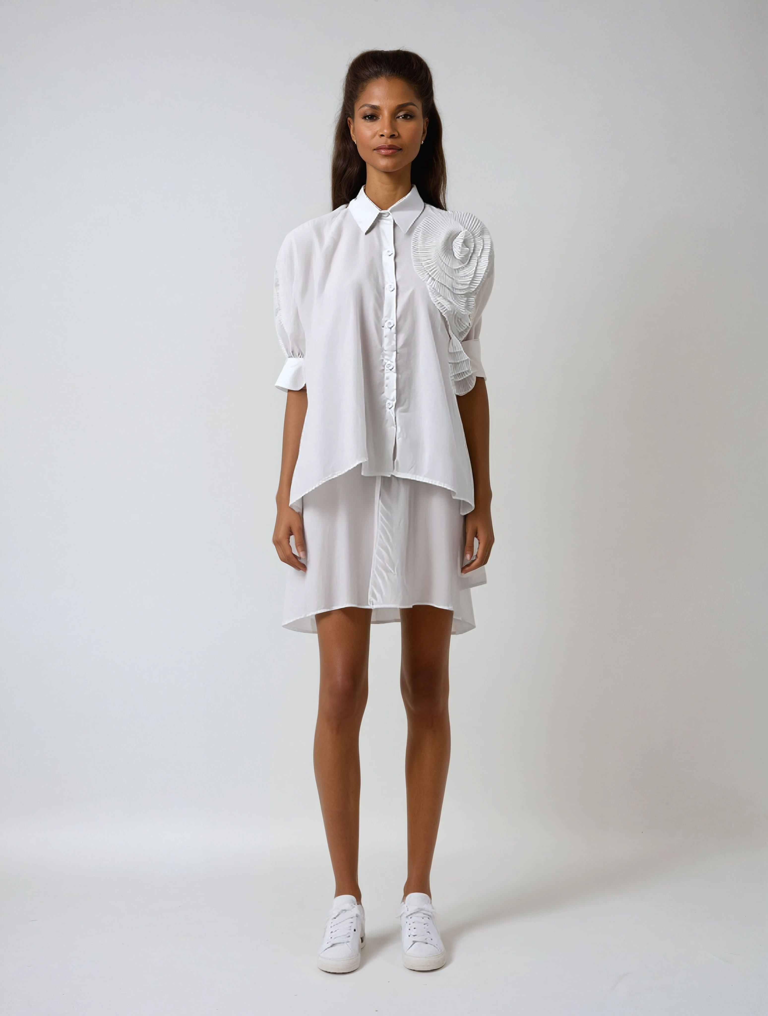 This standout piece blends the crisp elegance of a classic white shirt dress with avant-garde artistry. Featuring a sharp turn-down collar, button-front design, and a striking three-dimensional floral applique at the shoulder, it turns simplicity into a statement. The asymmetrical hemline creates a flowing, layered effect, while the oversized silhouette ensures relaxed, all-day wear.
