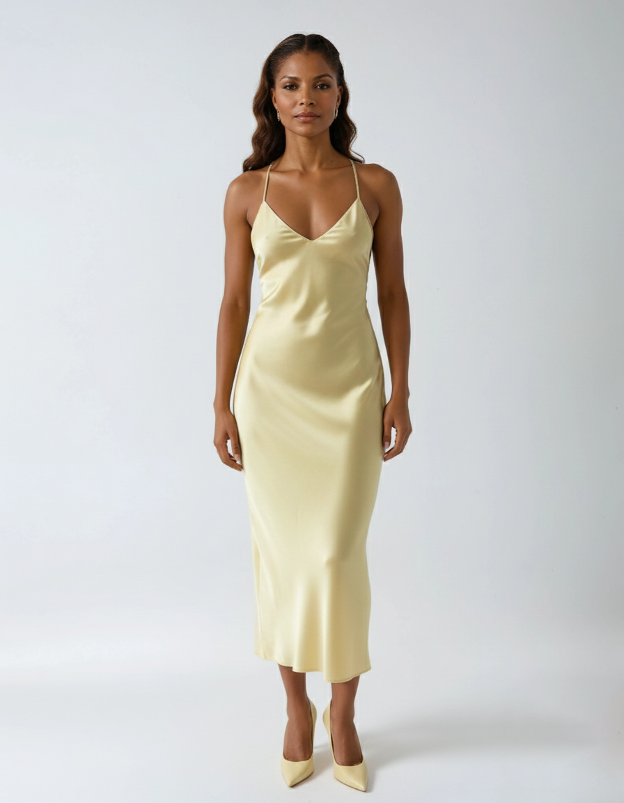 This yellow satin slip dress is the ultimate summer statement piece. Designed with a deep V-neckline and delicate spaghetti straps, it flows into a sleek straight silhouette that flatters the figure with effortless elegance. The backless design adds a sensual touch, while the mid-calf length balances sophistication and allure — making it perfect for both beachside escapes and glamorous evening parties.